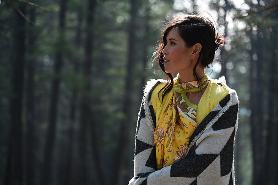 초점 거리 120mm, 조리개를 개방하여 배경의 나무를 흐리게 하고 인물의 존재감을 부각시킨 사진입니다. 옷이나 스카프의 질감, 머리카락이나 니트의 디테일도 선명하게 묘사되어 있습니다. 초점 거리 120mm는 피사체와 일정한 거리를 유지하여 촬영할 수 있어 인물 촬영에 적합하며, 자연스러운 표정과 움직임을 포착할 수 있습니다.
