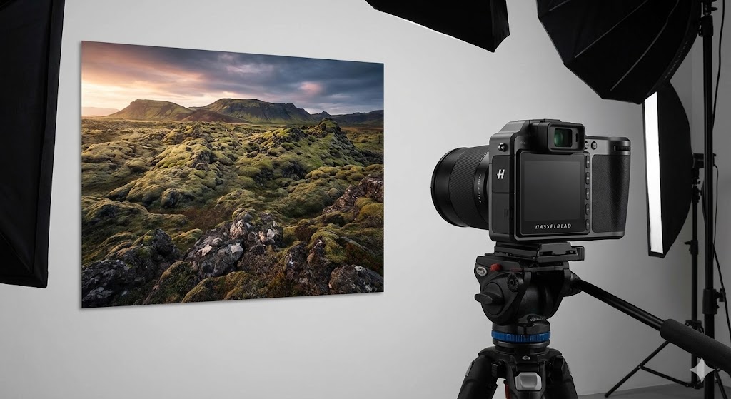 <핫셀블라드 중형 카메라와 그 결과물인 대형 파인아트 프린트. 압도적인 화질과 컬러로 예술 사진 시장을 공략한다.>