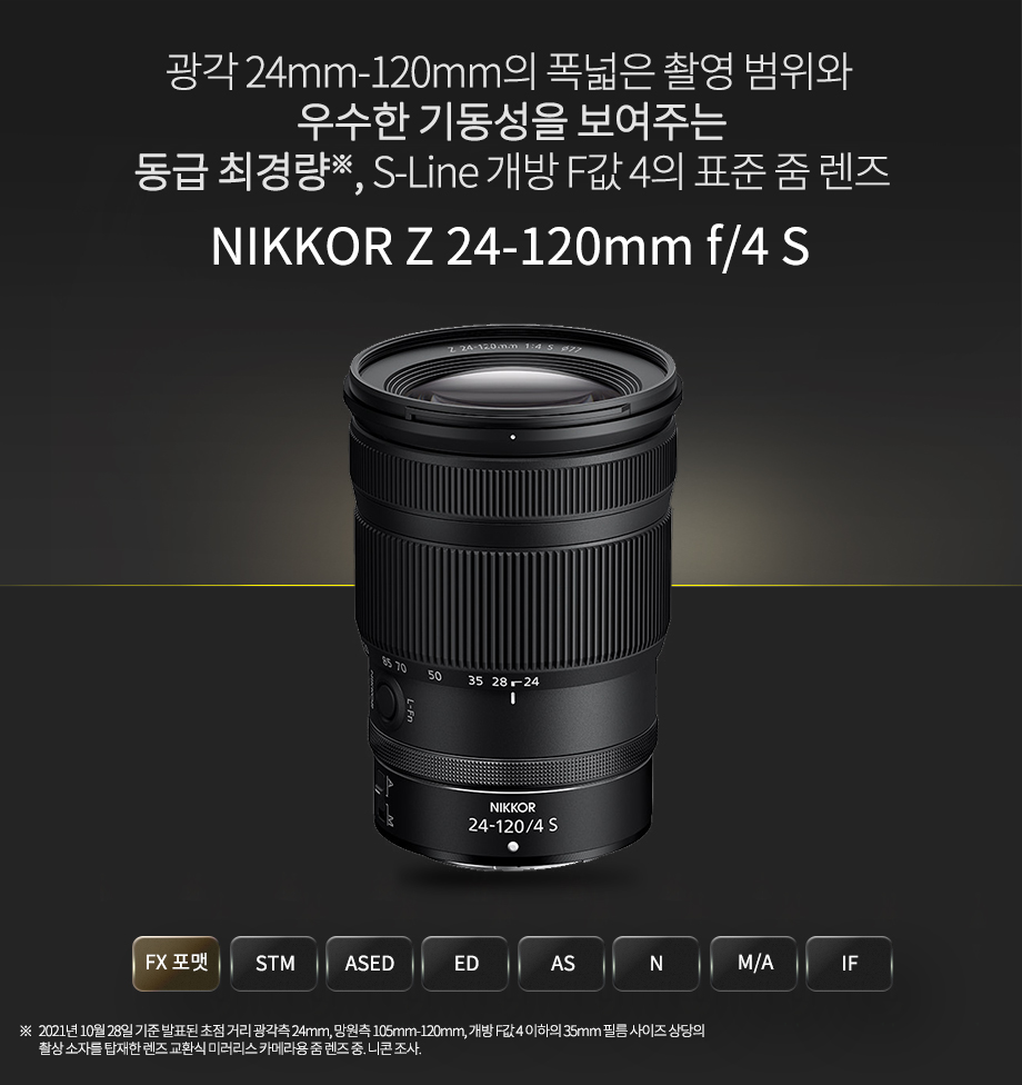 ※ 2021년 10월 28일 기준 발표된 초점 거리 광각측 24mm, 망원측 105mm-120mm, 개방 F값 4 이하의 35mm 필름 사이즈 상당의 촬상 소자를 탑재한 렌즈 교환식 미러리스 카메라용 줌 렌즈 중. 니콘 조사.● 본 렌즈 사용 시, 카메라의 펌웨어를 최신 버전으로 업그레이드하여 사용하여 주십시오. 펌웨어가 최신이 아닌 경우 렌즈를 제대로 인식하지 못하거나 일부 기능을 사용하지 못할 수 있습니다.